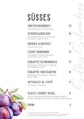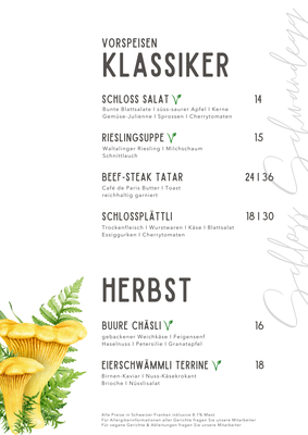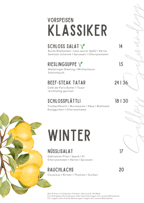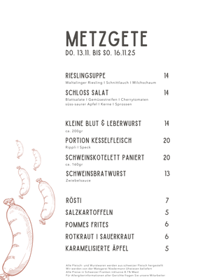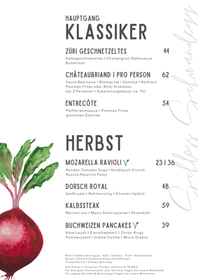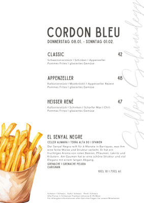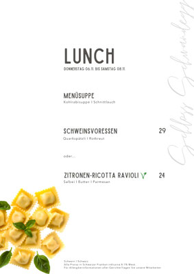 Unser Menü halten wir bewusst klein aber fein. Es ist uns sehr wichtig, mit regionalen und frischen Produkten zu arbeiten. Das Menü wird jede Woche mit einer anderen Empfehlung ergänzt. Bei Fragen oder Wünschen kommen Sie gerne auf uns zu.